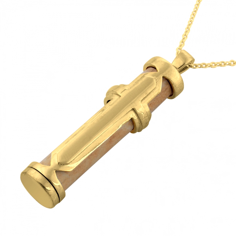 This unique pendant in 18k. matte gold finish consists of a cross embracing a hand carved piece of Jerusalem stone – the same stone used to construct the Holy Temple thousands of years ago.