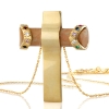 This stunning gold cross symbolizes the unbreakable and unwavering connection of Christianity with the Holy city of Jerusalem. The cross’s 18K. gold plated upright embraces a cross bar of hand carved Jerusalem stone with the ends of the cross bar being crowned by engraved golden bands with 12 colored stones representing the 12 tribes of Israel. This exquisite pendant brings together three central elements of two great faiths the Cross, Jerusalem and the Holy Temple.